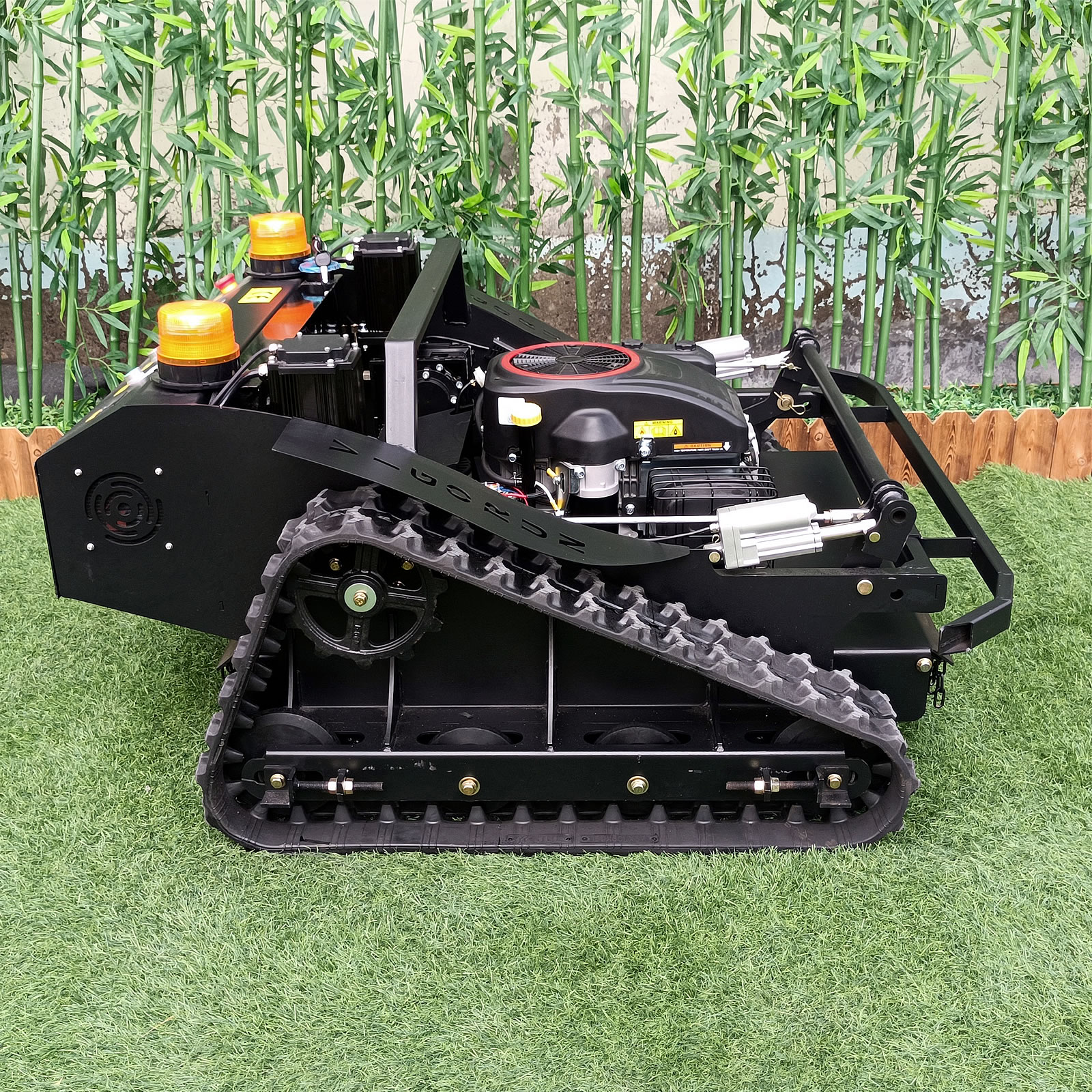 Remote control steep slope mower with Loncin electric start, forced lubrication gasoline engine 9.2Kw, 2 pcs 48V 1000W servo control walking motors with electronic brakes, high-torque RV063 worm gear and worm reducer made of 12-2 tin bronze, 56V 4000W dynamo that can ensure charging while working.
